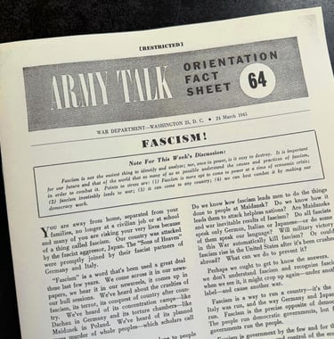 We found an army orientation bulletin about fascism from 1945, cleaned it up, and printed a bunch of copies to distribute free/low cost. You can order printed copies from us here or download and print your own below. You can also see a copy of an original on The Internet Archive (you can also download that copy there).